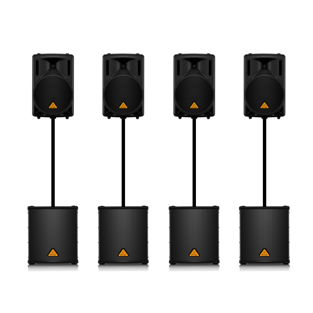 Each stack consists of one top and one sub with a distance pole between them. A total of 8 speaker cabinets, 4 tweeters, no less than 8 12" woofers driven by amplifiers distributed over all speakers, together approximately 4.000 watts.